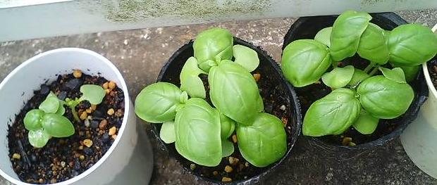 同じくらいのバジルの苗を同じ日に植えつけたほぼ同じくらいの大きさのポット