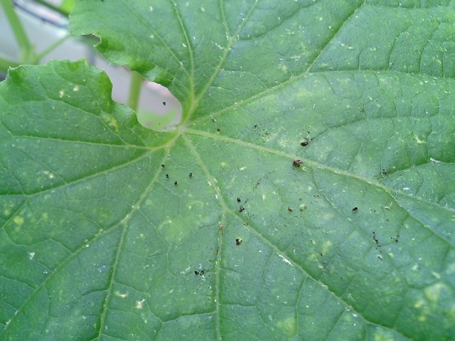 きゅうりは昨日も一枚の葉に3匹いるのを取ったのだけど、今朝もこんな感じでムシの糞が!