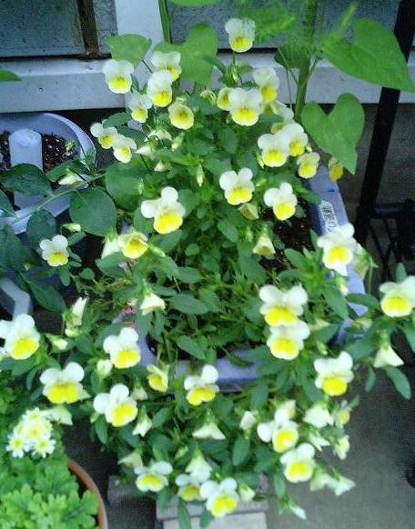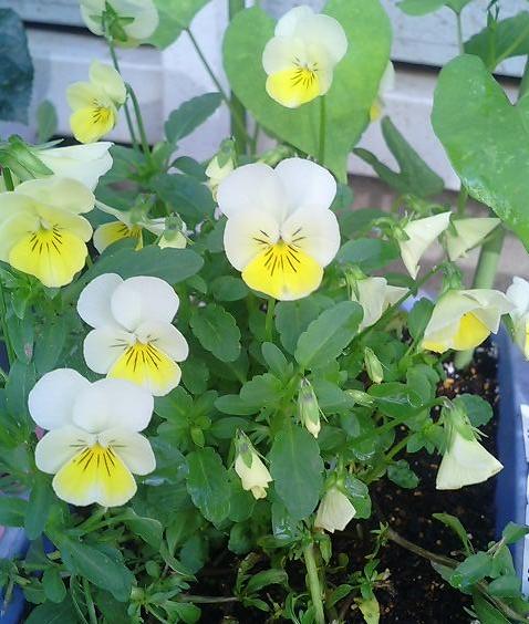 徒長しすぎたパンジーを子供の監視下で中途半端に切り戻したその後、すっかり復活してまたちょいと徒長気味に生長しています