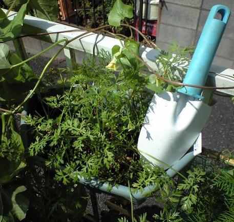 ニンジンの葉と水色スコップ