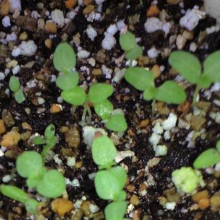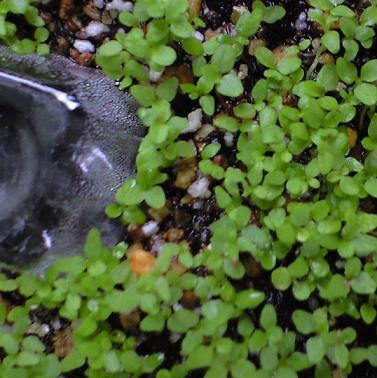 つりがね草種まきから16日目(写真中央とがった本葉のもの)