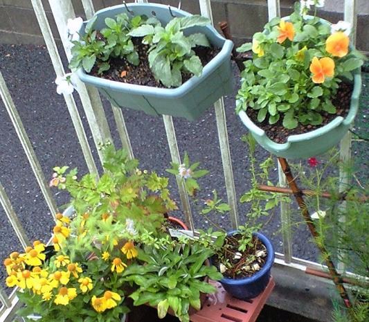 日当たりのよい角に置かれた(吊り下げられた)開花鉢を購入したパンジービオラと、キク科の鉢いろいろ