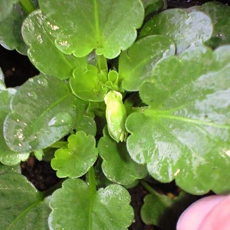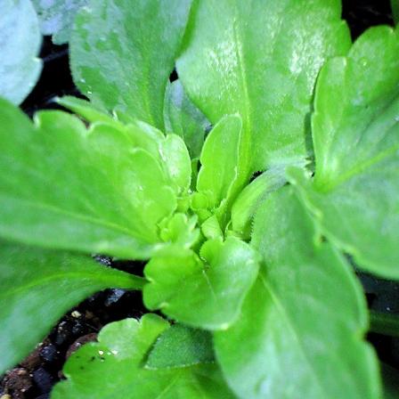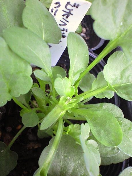 大きめな葉は生長の悪いビオラの苗(花がついたのもあると思えばまだこんなベイビーちゃんな苗もあります)
