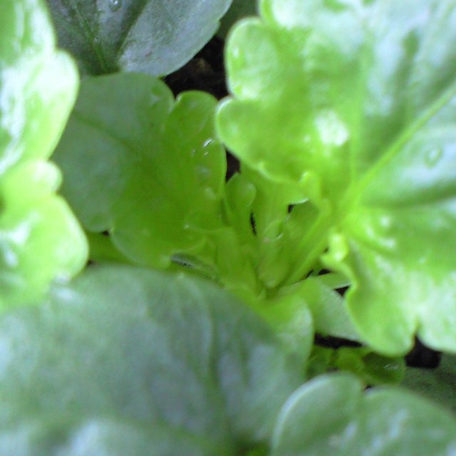 大きめな葉は生長の悪いビオラの苗(花がついたのもあると思えばまだこんなベイビーちゃんな苗もあります)