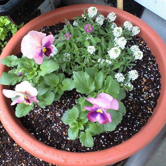 球根が咲くまでに植えこんであるパンジー(ピンクブロッチ)とアリッサムが元気に咲いてくれています